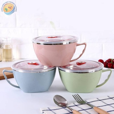 学生便当盒方便面碗带手柄防烫保鲜碗 不锈钢泡面碗带盖饭菜碗