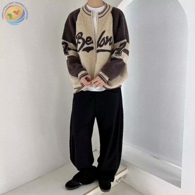 秋冬美式复古开衫上衣男潮牌宽松圆领撞色字母外套