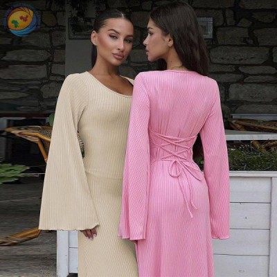 Simple temperament solid color square collar flared sleeve back lace design waist tight dress