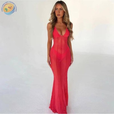 个性优雅纯色吊带v领漏胸纱网拼接透视挂脖紧身长裙