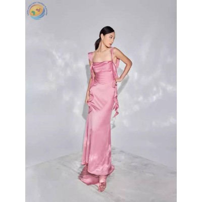 2024春季新款气质淑女纯色吊带荷叶边飘带缎面紧身收腰包臀连衣裙