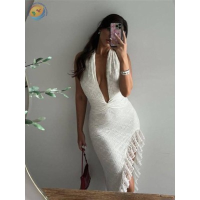 2024夏季新款欧美性感露背侧边开叉V领吊带连衣长裙