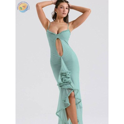 夏季新品甜美性感吊带低领漏胸镂空露脐荷叶边不规则连衣长裙