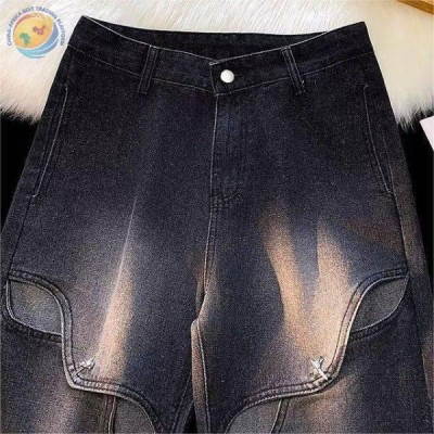Niche design jeans men\'s loose hollow-out wide-leg trousers American high street mopping trousers