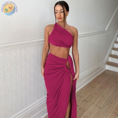 Temperament bare waist design sense hollow bare shoulder solid color high slit sheath skirt set
