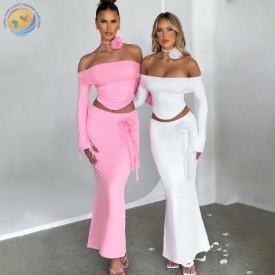 Temperament waist waist one-line shoulder lace-up flower trim tight long sleeve skirt set