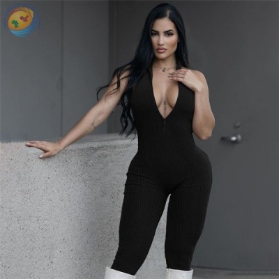 Sexy solid color hanging neck V-neck missing chest zipper design tight long jumpsuit women