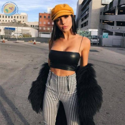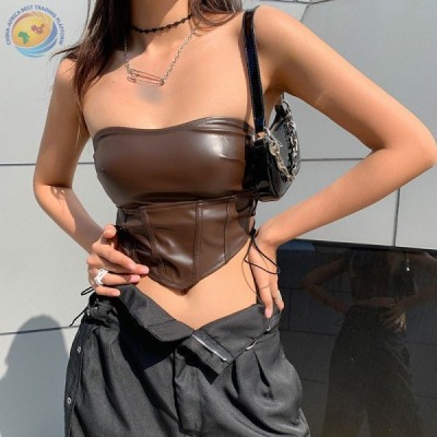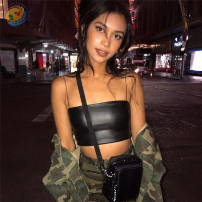 跨境新款欧美风性感细肩带黑色PU皮质吊带背心百搭修身抹胸春