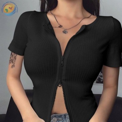 春季上衣V领性感纯色拉链开衩条纹上衣