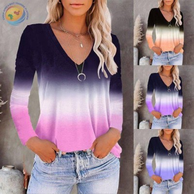 欧美女装V领渐变印花宽松t恤休闲长袖上衣女