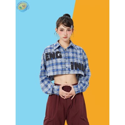 格子衬衫女长袖衬衣宽松短款露脐辣妹上衣潮