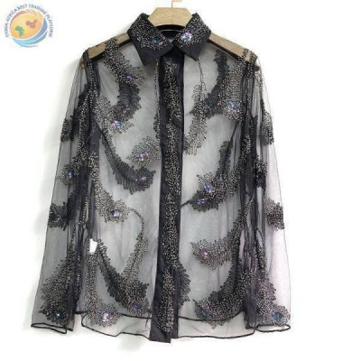 Square collar nail bead tail perspective sexy retro style long sleeve shirt
