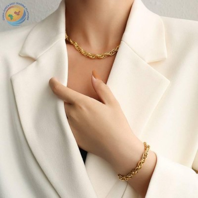 欧美素链环环相扣粗链百搭项链手链 钛钢镀18K金嘻哈时尚首饰套装