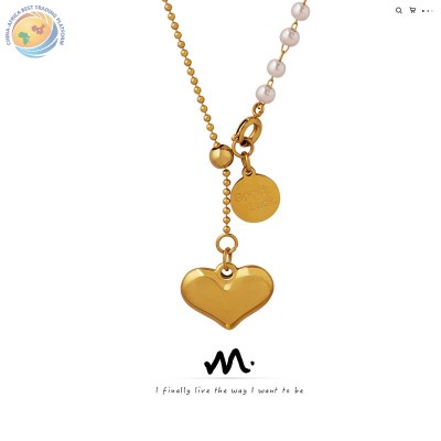 跨境热款饰品圆牌爱心项链流苏锁骨链钛钢18k金 复古仿珍珠项链女