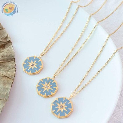 法式复古不掉色八芒星镶钻罗盘吊坠项链钛钢镀18K真金锁骨链 P093