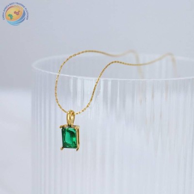 ins宫廷风祖母绿锆石吊坠宫廷风单钻项链钛钢镀18真金女饰品 P026
