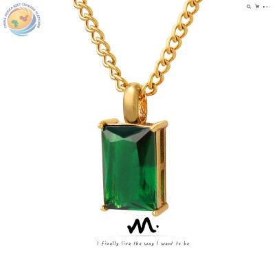 国潮中性风港式ins时尚不掉色祖母绿锆石方形吊坠项链钛钢镀18K金