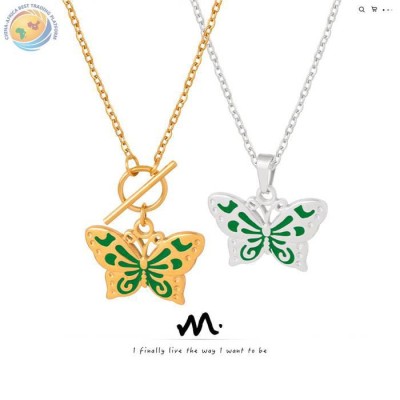 跨境新款高级时尚简约小众设计百搭钛钢镀金蝴蝶滴油吊坠项链饰品