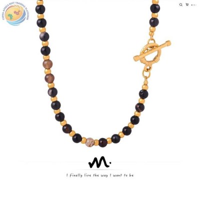 欧美新款复古宫廷风轻奢时尚天然石黑玛瑙手工串珠OT扣项链饰品女