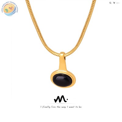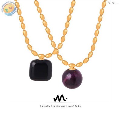 欧美跨境新款时尚复古轻奢钛钢镀金几何天然石玛瑙石吊坠项链饰品