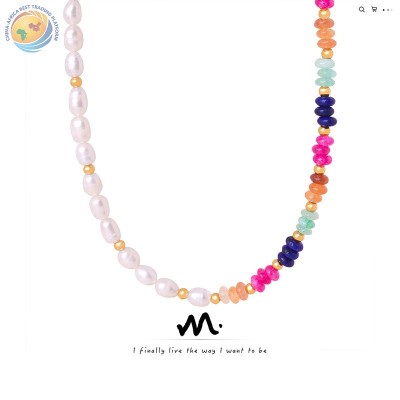 跨境新款复古轻奢高级感巴洛克淡水珍珠彩色天然石手工串珠项链女