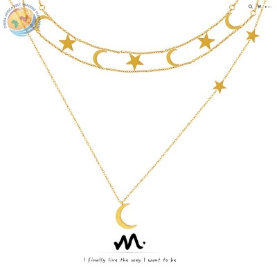 欧美浪漫星星月亮吊坠双层叠戴项链女锁骨颈链钛钢首饰套装 P896