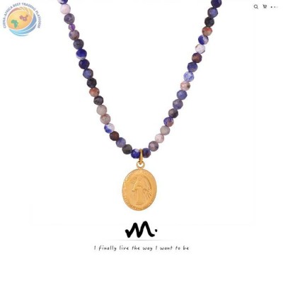 欧美跨境新款复古高级感轻奢天然石手工串珠项链钛钢镀金吊坠饰品