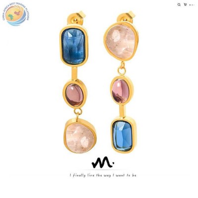欧美跨境个性设计钛钢不掉色耳环不对称镶嵌晶石彩色耳环饰品女
