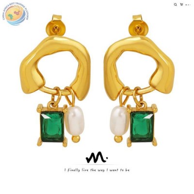欧美独特设计几何型淡水珍珠绿晶石吊坠耳环气质小众复古时尚耳饰