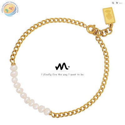 简约女生闺蜜礼物手链钛钢镀金链淡水珍珠串珠