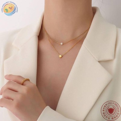 五角星吊坠仿珍珠项链双层叠戴钛钢18k金锁骨链女