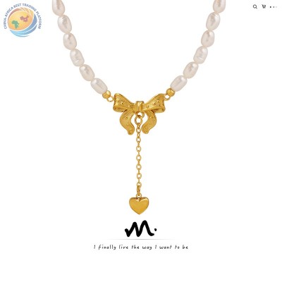 法式公主同款蝴蝶结流苏爱心吊坠淡水珍珠项链优雅