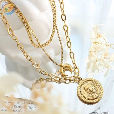 欧美嘻哈三层叠戴项链月亮狮子圆牌吊坠锁骨链