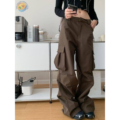 休闲时髦多口袋修身显休闲长裤阔腿高腰工装裤