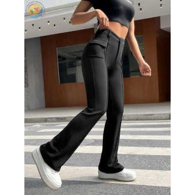街头口袋修身纯色弹力微喇裤休闲长裤