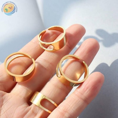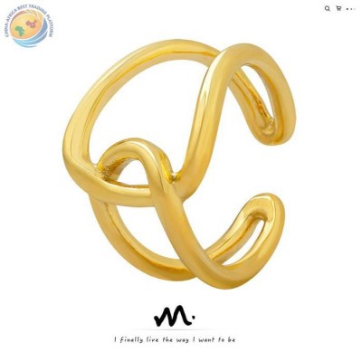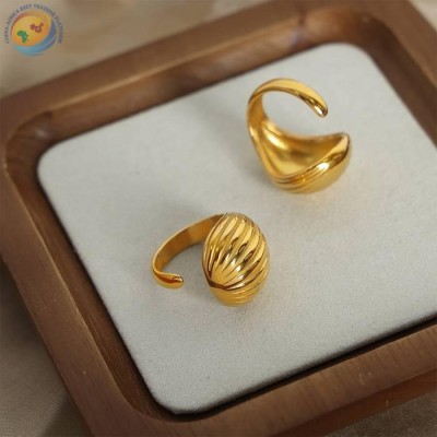 欧美新款冷淡风小众设计异形钛钢镀金条纹开口戒指
