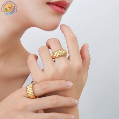 Light luxury style personality titanium steel gold plated with diamond linen pattern wide design ring ring