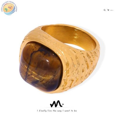 轻奢复古钛钢镀18K金天然虎眼石粉晶石戒指