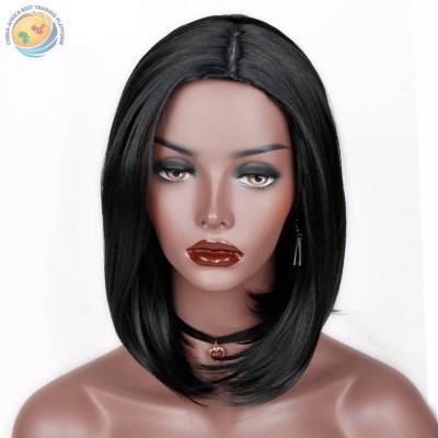 欧美假发女士内扣短直发自然逼真梨花头卷发黑色化纤中长直发头套