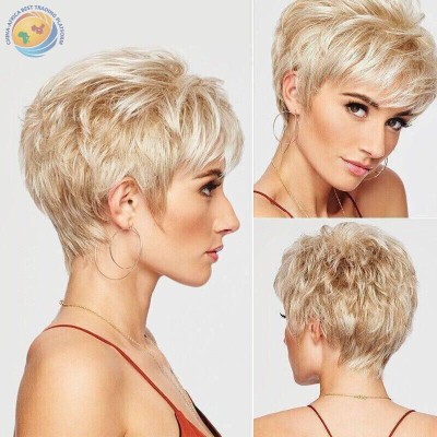 亚马逊新款短款卷发假发 wig斜刘海浅金色反翘卷欧美款式化纤发套