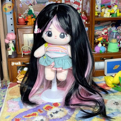 20cm棉花娃娃假发 黑色挑染粉色长直发 甜美女娃公仔玩偶假毛娃发