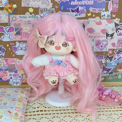 棉花娃娃新品假发20cm假发高温丝粉色长卷发人形玩偶公仔假头发套