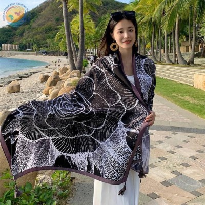 韩版黑色玫瑰轻薄款仿棉麻手感丝巾女外搭披肩
