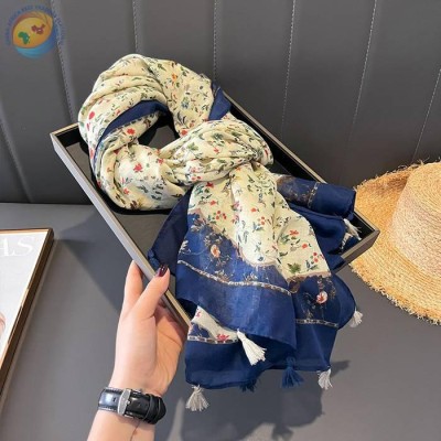 春秋复古碎花棉麻围巾女妈妈花朵丝巾长款纱巾