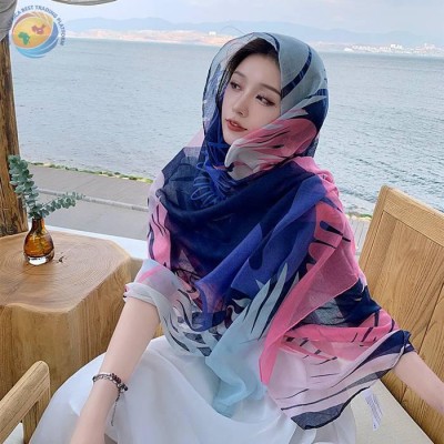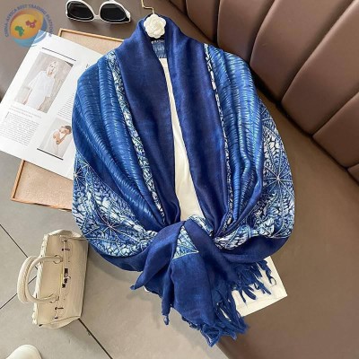 春秋新款蓝色系棉麻夏季印花围巾长款披肩
