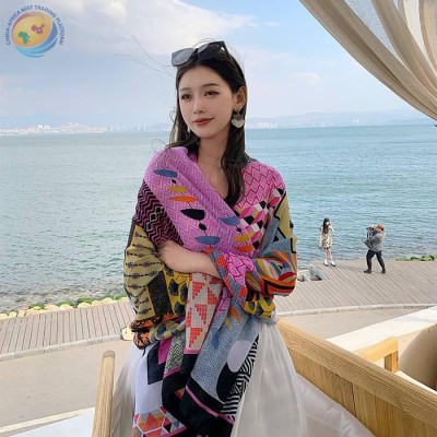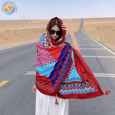 复古波谱拼色旅游防晒丝巾女民族风围巾