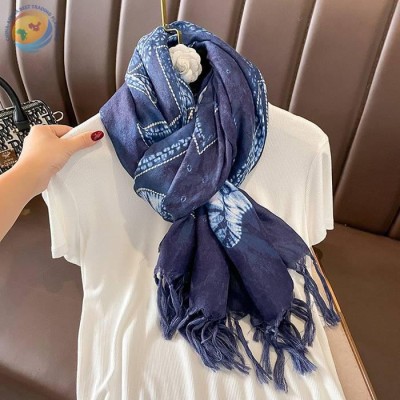 蓝色蜡染大长巾女围巾披肩两用保暖流苏
