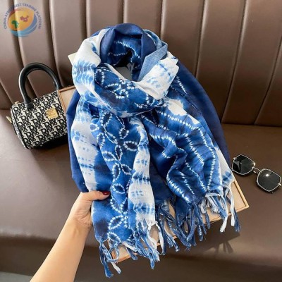 春秋季保暖防风蓝色蜡染长款棉麻丝巾