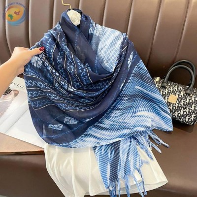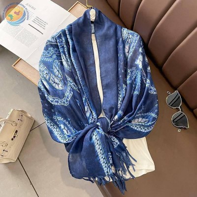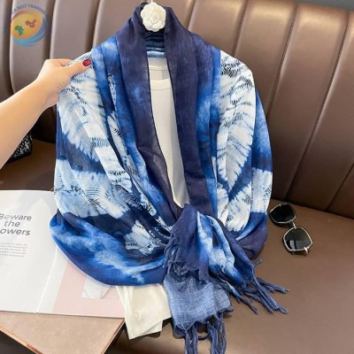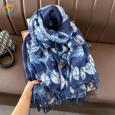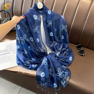 春秋蓝色蜡染棉麻手感180大长巾女围巾
