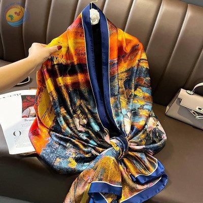 欧式风轻薄款油画菊花盆仿真丝女围巾披肩